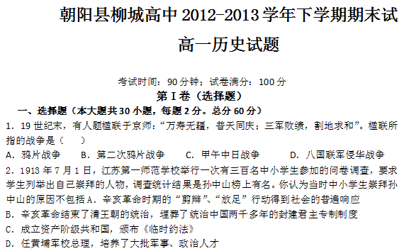 百度:辽宁省朝阳县柳城高级中学2012-2013学年高一下学期期末考试 历史试题 Word版含答案