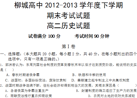 有道:辽宁省朝阳县柳城高级中学2012-2013学年高二下学期期末考试 历史试题 Word版含答案