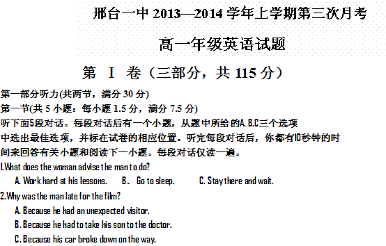 百度:河北省邢台一中2013-2014学年高一上学期第三次月考 英语试题 Word版含答案