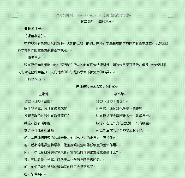 百度:2014届高一生物新课标示范教案:降低化学反应活化能的酶 第2课时(人教版)