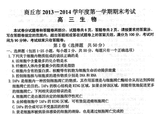百度:河南省商丘市2014届高三上学期期末统考试题 生物 扫描版含答案