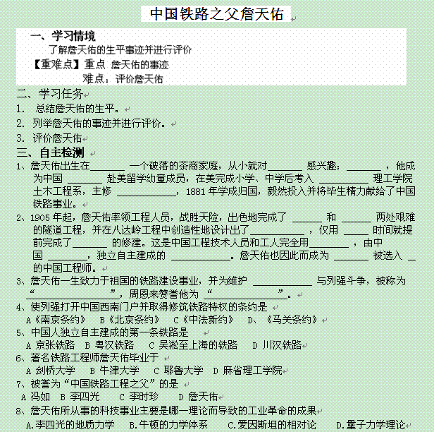 有道:河南省灵宝市第三高级中学高二历史学案:《中国铁路之父詹天佑》(新人教版必修4)