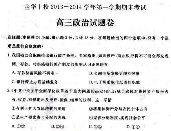 百度:浙江省金华十校2014届高三上学期期末考试政治试题 扫描版含答案
