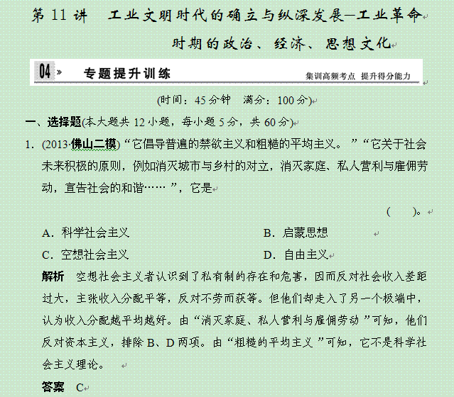百度:2014届高考历史二轮复习仿真提升练习: 第11讲 工业文明时代的确立与纵深发展——工业革命时期的政治、经济、思想文化(人民版) Word版含解析