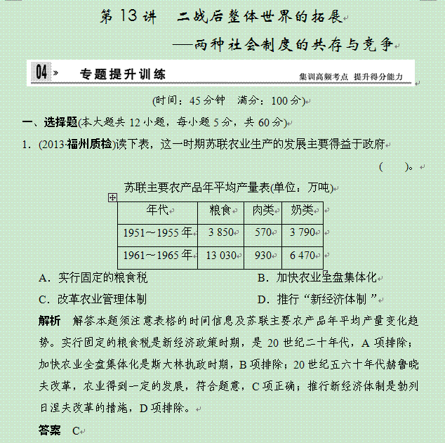 谷歌:2014届高考历史二轮复习仿真提升练习: 第13讲 二战后整体世界的拓展——两种社会制度的共存与竞争(人民版) Word版含解析