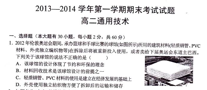 百度:浙江省诸暨中学2013-2014学年高二上学期期末考试通用技术试题 PDF版含答案