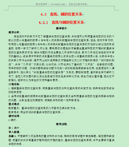 有道:2013-2014学年高中数学教案:4.2.1 直线与圆的位置关系1 新人教A版必修2