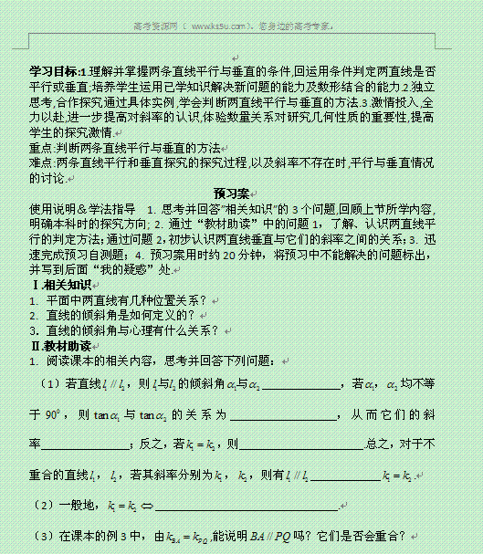 百度:四川省岳池县第一中学高中数学学案:3-1-2 两条直线平行与垂直的判定 必修三