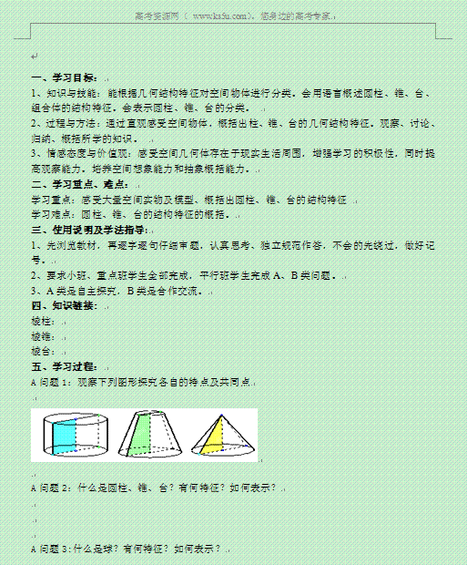 谷歌:河南省沁阳市第一中学2013-2014学年高一数学导学案:1.1.1圆柱、锥、台、球、组合体的结构特征
