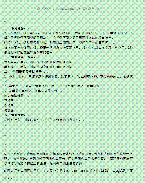 百度:河南省沁阳市第一中学2013-2014学年高一数学导学案:1.2空间几何体的直观图