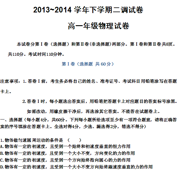 有道:《KS5U首发》河北省衡水中学2013-2014学年高一下学期二调考试 物理试题 Word版含答案