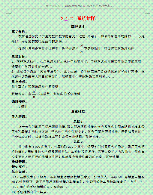 谷歌:2013-2014学年高中数学教案:2.1.2 系统抽样 新人教A版必修3