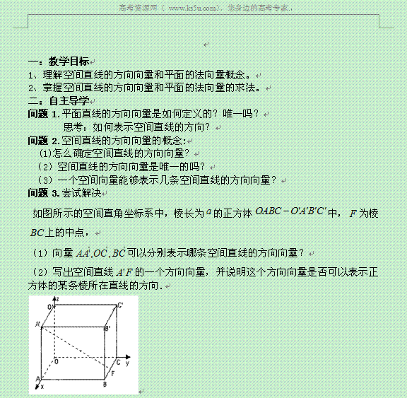 有道:江苏省灌南高级中学高三数学复习导学案:空间直线的方向向量和平面的法向量