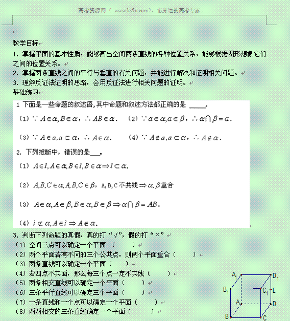 有道:江苏省灌南高级中学高三数学复习导学案:平面的性质与直线的位置关系