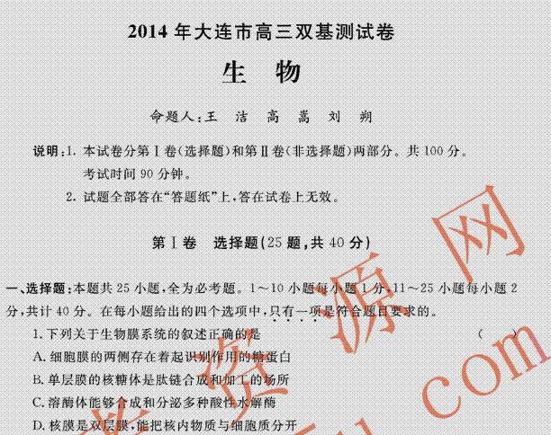 百度:《KS5U首发》辽宁省大连市2014届高三双基测试 生物试题 扫描版含答案高清