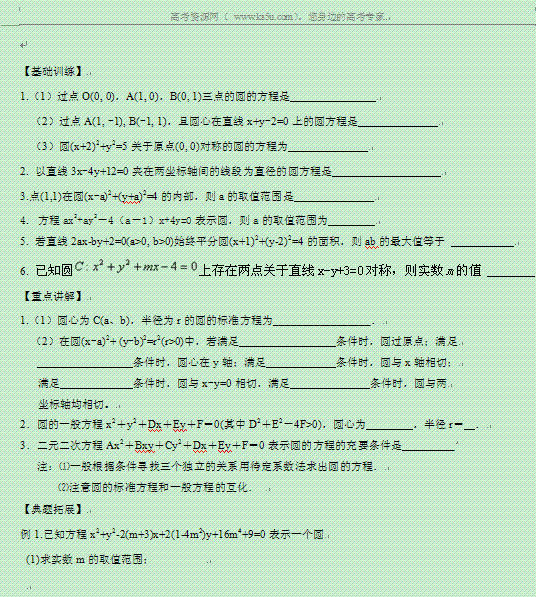 百度:江苏省响水中学2013-2014学年高二上学期数学学案:《第48课时 圆的方程》