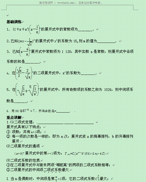 百度:江苏省响水中学2013-2014学年高二上学期数学学案:《第54课时 二项式定理》