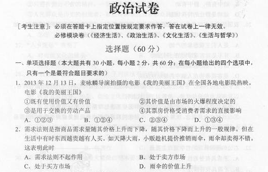 有道:云南省2014年1月普通高中学业水平考试政治试题 扫描版无答案