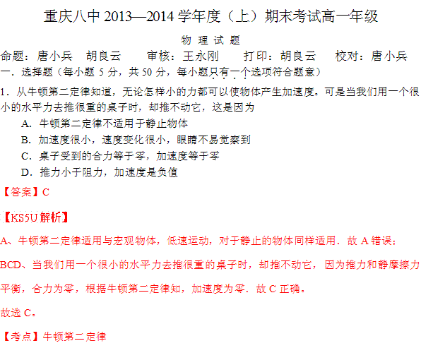百度:《KS5U解析》重庆八中2013-2014学年高一上学期期末考试 物理试题 Word版含答案 Word版含解析 by张