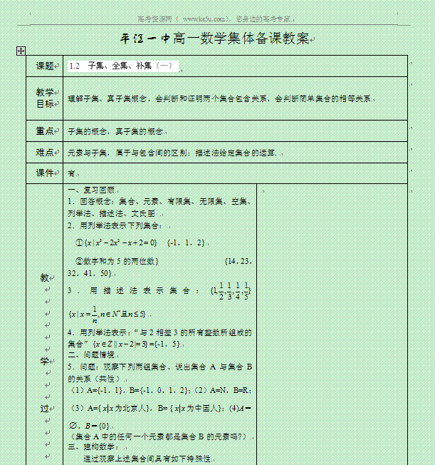 谷歌:湖南省平江一中高中数学教案:1.2子集、全集、补集(一) 必修一