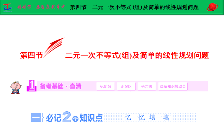 百度:2015届高考人教版数学(理)大一轮复习精讲课件:第6章 第4节 二元一次不等式(组)及简单的线性规划问题