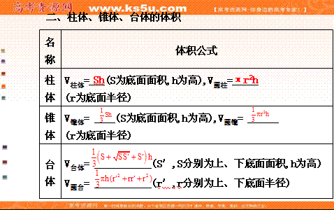 百度:《全程复习方略》2013-2014学年高中数学(人教A版必修2)教师用书配套课件:1.3.1 柱体、锥体、台体的表面积与体积(共54张PPT)