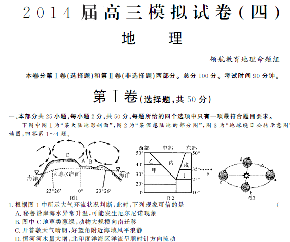 百度:《领航密卷》2014届高三第四次模拟考试地理试题(新课标人教版) PDF版含详解