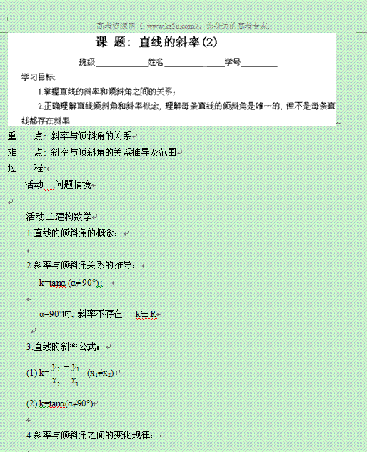 百度:江苏省盐城市射阳县第二中学2013-2014学年高一下学期数学活动单学案:(21)课 题 直线的斜率(2)