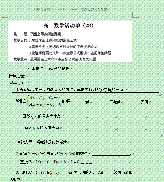 谷歌:江苏省盐城市射阳县第二中学2013-2014学年高一下学期数学活动单学案:(28)平面两点间的距离 2