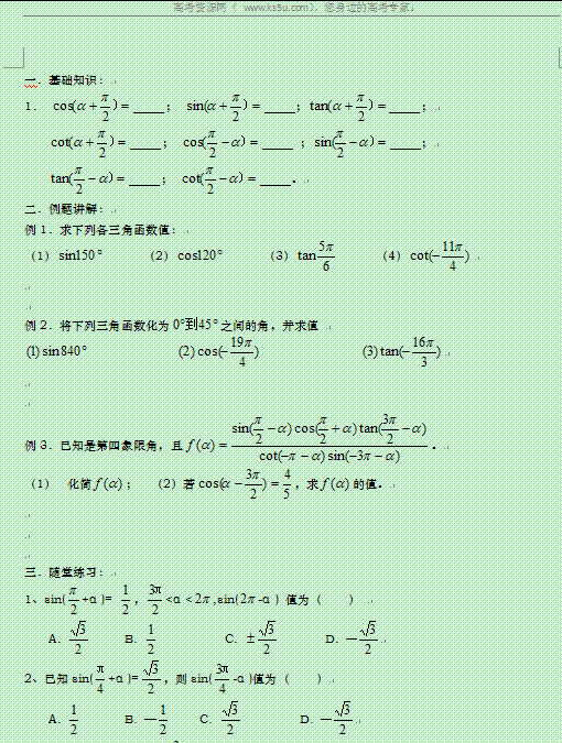 谷歌:江西省南昌市新建一中高中数学学案:124 三角函数的诱导公式(二)