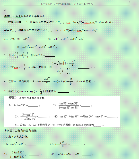 百度:陕西省汉中市陕飞二中2014年高考数学复习学案:两角和与差及二倍角的三角函数