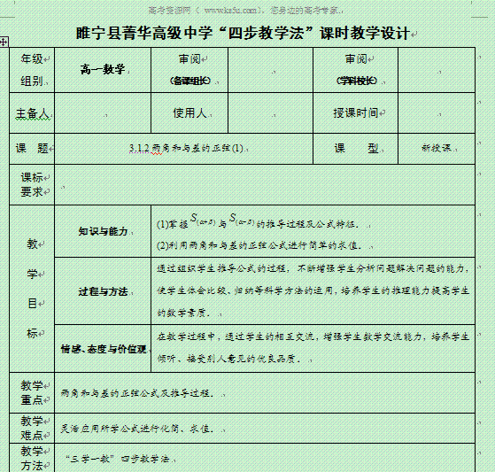 百度:江苏省徐州市睢宁县菁华高级中学高一数学“四步教学法”教案: 3.1两角和与差的正弦公式(1) 苏教版 必修四
