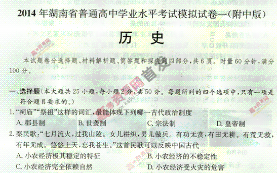 百度:《KS5U首发》湖南省2013-2014学年高二下学期普通高中学业水平考试模拟试卷(一)(附中版) 历史 扫描版含答案