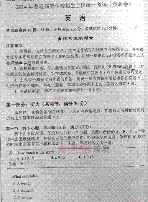 百度:2014年高考真题——英语(湖北卷)速递版 扫描版含答案