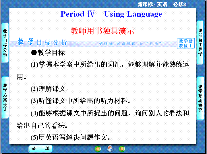 有道:2014秋高中英语(新人教版必修3)教学课件(目标分析+方案设计+自主导学):Unit 4-Period Ⅳ