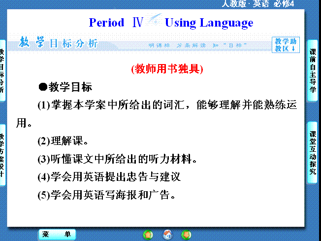 有道:2014秋高中英语(新人教版必修4)教学课件(目标分析+方案设计+自主导学):unit2PeriodⅣ
