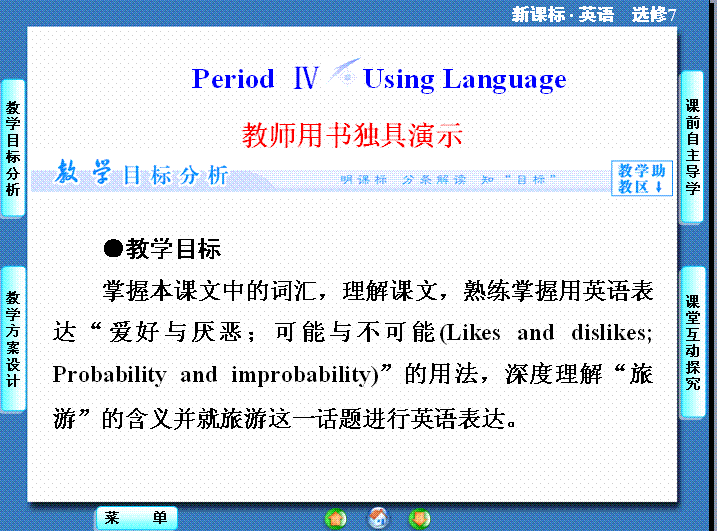 有道:2014秋高中英语(新人教版选修7)教学课件(目标分析+方案设计+自主导学):Unit 5-Period Ⅳ