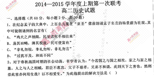 百度:《KS5U首发》河南省中原名校2014-2015学年高二上学期第一次联考试题 历史 扫描版无答案
