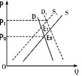 2. 右图反映的是供给与需求同时变动对均衡点的影响(图中横轴为供求量q,纵轴为价格p,d为需求曲线,s为供给曲线,变动的方向为d→d1,s→s1,交点e0和e1为均衡点)。不考虑其他条件,与e0→e1反映的供求变化状况一致的是