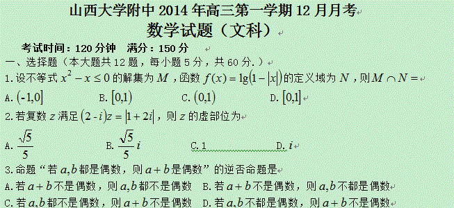 百度:《Ks5u首发》山西省山大附中2015届高三12月月考数学(文)试题 Word版含答案
