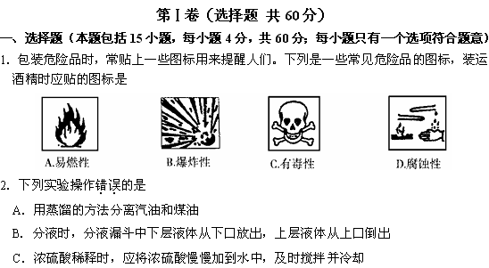 百度:《KS5U首发》辽宁省大连市2014-2015学年高二上学期期末考试 化学 (文) Word版含答案