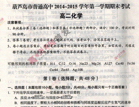 百度:《Ks5u首发》辽宁省葫芦岛市2014-2015学年高二上学期期末考试 化学 图片版含答案