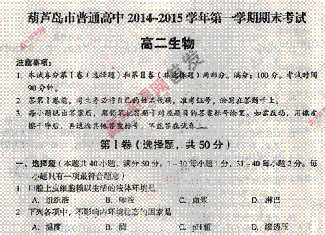 百度:《Ks5u首发》辽宁省葫芦岛市2014-2015学年高二上学期期末考试 生物 图片版含答案