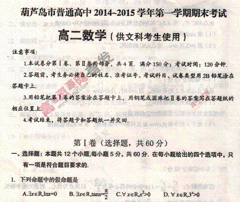 百度:《Ks5u首发》辽宁省葫芦岛市2014-2015学年高二上学期期末考试 数学(文) 图片版含答案