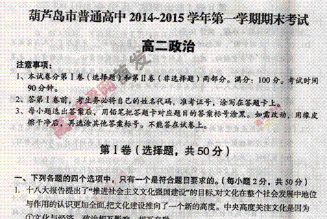 百度:《Ks5u首发》辽宁省葫芦岛市2014-2015学年高二上学期期末考试 政治 图片版含答案