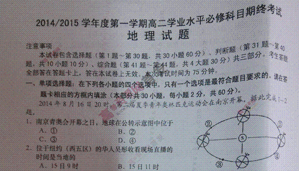百度:《KS5U首发》江苏省盐城市2014-2015学年高二上学期学业水平必修科目期终考试 地理 扫描版含答案