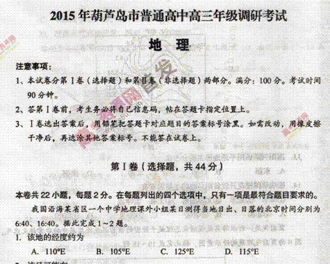 谷歌:《KS5U首发》辽宁省葫芦岛市2015届高三上学期期末考试 地理 扫描版含答案