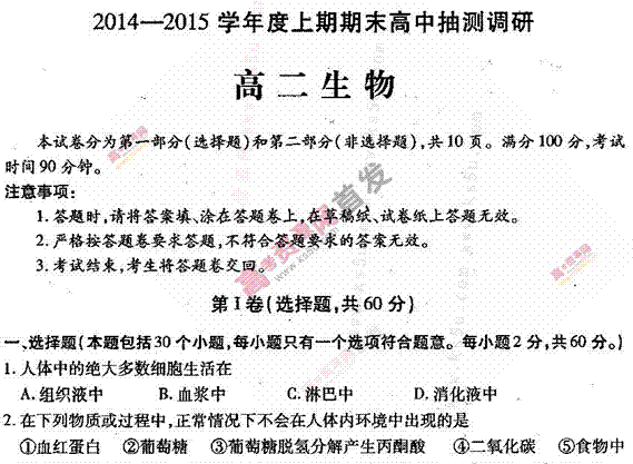 百度:《KS5U首发》河南省周口市2014-2015学年高二上学期期末抽测调研试题 生物 扫描版含答案