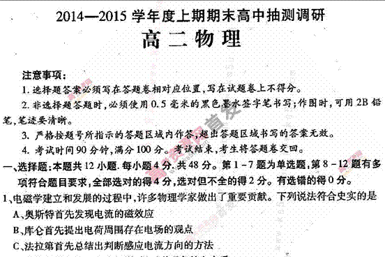 有道:《KS5U首发》河南省周口市2014-2015学年高二上学期期末抽测调研试题 物理 扫描版含答案