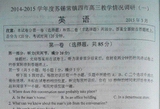 谷歌:《Ks5u首发》江苏省苏锡常镇四市2015届高三下学期教学情况调研(一) 英语 扫描版含答案